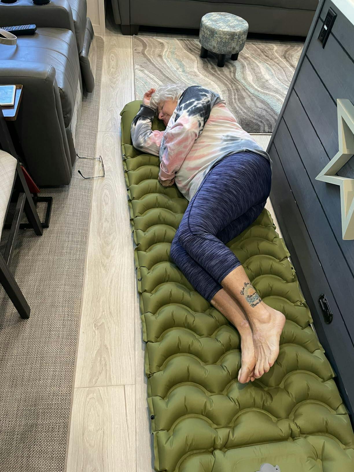 I have put off buying one of these because I have back problems and like a squishy bed. The idea of sleeping on the ground without an actual air mattress makes me cringe.That said, I laid on this thing and my brain can't really wrap around how comfortable it is. There's nothing to it! How is this possible?I like how smooth it is. The blue color is perfect. And then the foot pump absolutely blew my mind. I did not know this was a thing! What a time to be alive. Blew it up in 3 minutes? While reading the instructions at the same time lolI do woman camp with crossroads in Cincinnati every year and will be ditching the air mattress going forward for this thing.Highly recommend!